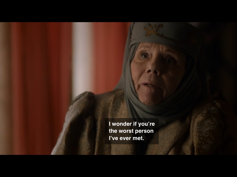 I really love grandmother Olenna Tyrell. She's wise, knows how to play the Game of Thrones, and isn't afraid to speakher mind. Her conversation with Cersei was probably one of the best written that the series has to offer.So after watching "The Broken Man" on Game of Thrones last night, I'm pleased that the Hound is still with us. "You must be here for a purpose," a priest says to Sandor Clegane. But what purpose? Many readers of the books think it has to do with Cersei's impending "trial by combat" and the fact that her champion will be "The Mountain" and the faith's champion will be "The Hound." It's long been a speculation swirling on the internet. I don't know if I ever really bought into it, or thought that would even be a fair fight (given that I think The Mountain is pretty much unkillable in his undead state). But if anyone ever stood a chance against The Mountain, it's The Hound. Maybe The Mountain is super flammable (a thing that all undead on the show seem to be). If that's true, then that's a weakness The Hound could theoretically exploit (if he even figures out what has happened to his brother). However, it also presents its own set of problems though because the Hound is afraid of fire.