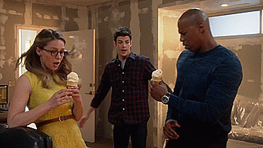 calories a day just to stay thin. That's a superpower with some kick to it.I love the expression on Supergirl's face when she realizes that she has ice cream. But there's no way Barry paid for it so there is that issue...Barry you thief! Unless of course he just left a $20 and was like "keep the change." But there were so many great moments from the crossover. Seriously. And the best line of the night went to Cat Grant who kinda/sorta had a Deadpool-esque "break the fourth wall moment" when she commented that the cast of characters before her looked like the youth-obsessed, attractive, and racially diverse cast of a CW show. Oh my.
