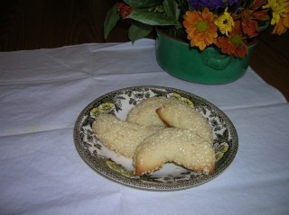 Mix everything together (except the sesame seeds). Take about 1 tablespoon of the dough and roll into cigar, or I like the crescent shape myself, then roll in sesame seeds. Place on lightly greased cookie sheet and bake 12-14 minutes.
