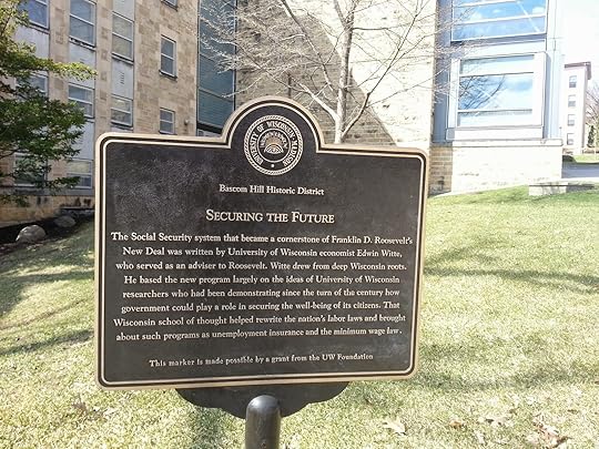 More often than not Social Security and other safety-net programs get a bad rap. Politicians and reporters call them "entitlements"--which sounds derogatory to me--and popular wisdom says they'll need to be curtailed or they'll eventually break the federal budget. But there's no hint of doom and gloom on Bascom Hill, where this sign proudly proclaims University of Wisconsin Professor Edwin Witte's role in the development of Social Security. And this bold declaration is within sight of the Capitol Building, where Scott Walker, enemy of labor unions and public education, is trying to leverage his governorship into a presidential candidacy. Fortunately, Social Security has lasted longer than the careers of many nay-saying politicians and hopefully will continue to help government secure "the well-being of its citizens" for many years to come.