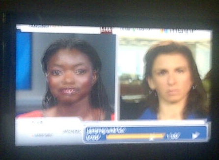 I could hear Jodi Kantor saying she couldn't hear anythingAnyway, at 10:37a, one of the producers came to get me. We passed the blinking "On Air" sign and entered a big studio that had a bank of people sitting at their computers on one side, and the set on the other. Chris Jansing was sitting in her anchor's chair. When I was fully mic'd, the sound guy walked me to the guest chair and adjusted the mic a bit more. I sat facing Chris, but right behind her I could see a few monitors, one with me on it, and one with the B-roll going. Now, right before I went on air, my editor Alexis (who assigned me the Obama Effect story) called to give me a few on-camera pointers, so I knew not to focus on the monitors and keep my eyes on Chris. I did watch the commercial playing on mute though.