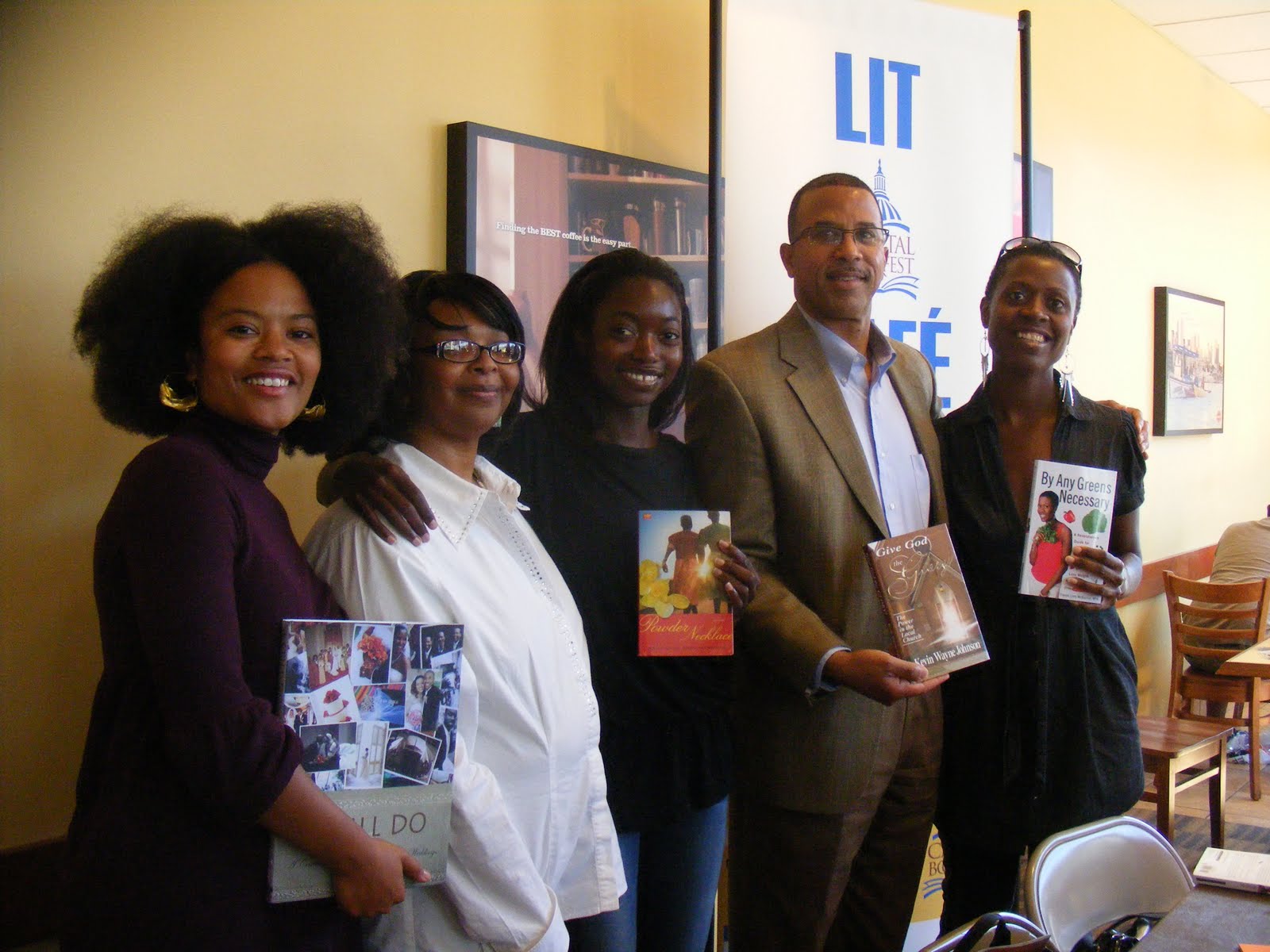 I sat on a panel with three other authors -- Kea Taylor, Tracye McQuirter, and Kevin Wayne Johnson -- moderated by Miss Ella Curry. Our panel was on "The Writing Life: Stories on Getting Published and Selling Books" and it was a lively and informative discussion for me as well as the attendees I think. We had all published different genres of books so I think we all had something useful to share. Kea's book is called I Still Do: A Celebration of African American Weddings and its a beautiful coffee table book of photographs. Tracye wrote a book called By Any Greens Necessary sharing recipes and other useful tips to transitioning to a healthier plant-based diet. Kevin was the veteran among us. His book Give God the Glory is part of a nine-book series that's been translated into a gazillion languages.