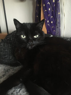 Tinycat on the eve of her 13th birthdayTechnically, her birthday was yesterday (we think. One does not know with rescues, but why not choose Valentine's Day when the date is "sometime in the middle of February"?). She resembles here a small, disgruntled owl for two reasons: one, she hates to be photographed, and she always knows when that is happening, and two, because Murdercat is closer to the food dishes than she is, and even though no one will be fed while I am playing paparazzi, she resents even the possibility that he might eat first. The Patchwork Terror is out of frame, which is why that ear is cocked, but she's not mad at him.