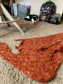 And I wasn't going to write about any of this, sweartogod. I was going to write about The Patchwork Terror and how, in his quest to eat all of Tinycat's scarfed-and-barfed breakfast, he chewed a big chunk out of the first clapotis I ever knitted. And how I did not quite freak out because he's not Idris: he shreds and gnaws whatever he eats to tiny pieces, even wee bits of kibble-treats, so I was pretty sure he hadn't swallowed long strands. (He never did throw up a damn bit of it. Where has it gone? The obvious answer--through him--has not manifested. He either reduced that wool to tiny pieces and digested it along with his food or it's still sitting in his gut, making itself into the grandmother of hairballs.) But also, ferfuckssake, I was upset, too, at the destruction. The loss. That clapotis--hours and hours of knitting, out of a indie-dyed colorway--is irreparable and irreplaceable. Of course PT was, is, more important, and I would set fire to the clapotis myself to keep him safe, but he's also fine, and fortunately not inclined to chew on textiles unless someone has thrown up on them first. This is a one-time catastrophe.