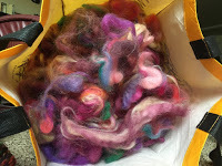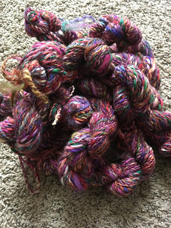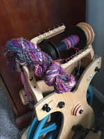 e) Kaiju-kitten has matured enough that I can spin again without having him attacking the wheel and ransacking the fiber, and so this is happening. The bag of fiber is a bunch of different dye lots and fiber combos (wools only, all from the amazing dye pots of M. at Blarney Yarn) all torn up into little bits, to be spun at random, like a grab-bag of colorful goodness. The results are...double-ply hanks of colorful goodness, that will all probably end up being a throw rug.So yes. Happy Leap Year. I have a game to prep.