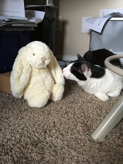 But there is good news. One of my students from fall quarter came dashing into the gap between my last two face-to-face classes this school year, damp from the downpour, to give me a stuffed bunny. She gives stuffed bunnies to her favorite teachers, but she thought I hated cute things (because my desk at work is populated with small rubber and stuffed lizards, frogs, snakes, an a small, plastic Godzilla), so she got me some lovely handlotion from Origins at the end of fall quarter. When she discovered that I do like cute fuzzy things, she promised me a bunny. And when they announced spring distance learning, she made sure to get the bunny to me so I would "have something cute on my desk."