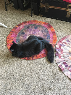 The outer ring was...Polwarth, I think? And it felted like a champ. It's more rigid, which means the rug doesn't wrinkle and obviously Murdercat approves, so what else does a rug need?