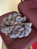 So that bagful of related fibers I started spinning last entry is, well, spun. I've got roughly 750 yards of worsted in a BFL/silk/I dunno, something woolly blend. I was expecting more purple and blue; I am a little surprised by the prevalence of the golds and greens. I think the greyish cast is mostly from variations of lavenders plus the light in the room, and that, when it's knit into whatever it becomes, the overall effect will be more purple-y.
