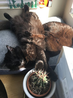 I am also given to understand that black cats are not as Instagrammable (seriously told this by someone who works in cat adoption) as cats with colorful fur. I wish to argue that, in fact, even black cats have color when sufficient sunlight is applied. Tinycat (there on the right, lying on top of her own head) is turning auburn in her senescence. She turned 11 this month.