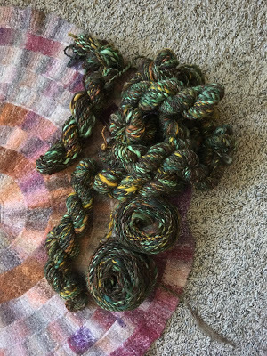 I've also spun a lot of wool. This batch is made of unrelated bundles of fiber in complementary colors, mixed together and spun at random. There's camel in there, various sheep wools, who knows. It's becoming a rug as we speak.