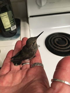 And thus began the Hummingbird Chronicles, aka The Weekend. We read the interwebz. Call a rescuer, they said, for babies, which she clearly was not But they also said, 72 hours for sugar water only is okay, if the bird seems just stunned, and try fruit flies all mashed up. Also, the time between trying to fly and actual flight is, like 1-3 days. So okay. She'd clearly tried flying. Maybe she could...try again. Soon. And leave. Except... when she flapped, one wing would not quite extend laterally, although when she folded them, they sat symmetrically on her body. Not a dislocation, not a break, but something wasn't right.