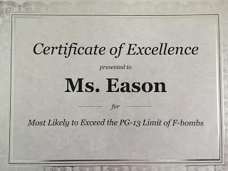 The HS students give teacher awards. But I was provoked.So... I didn't have much left for students at the HS who were dealing with murdered friends and school shootings all over and general teenageriness. I had even less left for the ostensible adults in uni who sit in my office and explain that they just can't write this boring essay, they just don't do well on things they don't like, it's who they are. (While assuring me it's the class, not me, that they hate. I assured them back: I don't hate you either, okay? But your grade is sinking like a sinking thing, kid, so you better find it in yourself to adult and write the fucking essay. I didn't say fucking. That time.) There are moments when I feel like a crap teacher, which I know is, well, crap, because I'm good at this job and they have to meet me partway or it doesn't work. And there have been amazing students, too, just stellar. They are the reason I keep doing this job, right there.