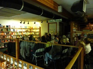 Thursday night's reading was great fun — many friends in Ashland came to listen and asked some good questions. Bloomsbury Books is a lovely place to read, as you'll see in the picture below. The bookstore itself was pretty quiet that evening, but we packed the upstairs balcony.