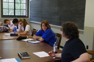 Maureen on the right, talking to one side of the table