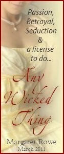 Any Wicked Thing, a Margaret Rowe book from Berkley Heat, comes out March 1. I got an early copy today from my editor's assistant in the mail, and it's really beautiful. I'll get a whole box of them at the end of the month, some of which will be given away as prizes. (click on Margaret Rowe's contest link for a chance to win one this month, and Maggie Robinson's contest link to enter for a chance to get a copy of my critique partner Tiffany Clare's The Seduction of His Wife)