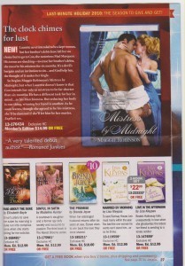 And I'm late even with that, unless January has 34 days. Things have been busy in Robinsonworld. My husband's health continues to improve and I'm out and about promoting Mistress by Midnight. Tomorrow I'll be at The Romance Dish giving away a hardcover copy, just as I am on this site's monthly contest. Selling rights to the book clubs means hardcover copies are printed, which was so exciting for me that I joined the Rhapsody Book Club and ordered my own books, LOL. You can see how they advertised MbM in their catalog…my family will probably put "The clock chimes for lust" on my gravestone.