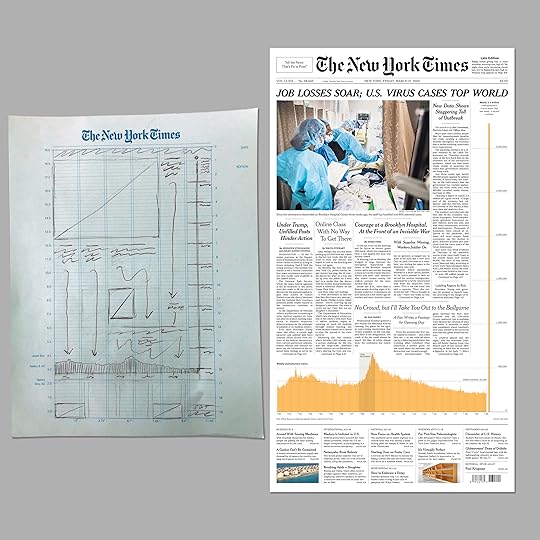 But of course these differences aren’t really reducible to a few letters, are they? Hence, in part, the growing reliance on graphics to ‘show not tell’ what the differences mean. Over the last year, no thanks to Covid, we saw these graphics consume entire front pages of newspapers not just to a degree never seen before but in ways never seen before. As happened in a cruder form in the wake of 2008, though, the shifts in order are so extreme that they even challenge the physical formats of a print media (which webbified versions still refer to and depend on). Yesterday’s gob-smacking gyrations becomes tomorrow’s barely perceptible noise at the foot of an impossibly steep visual cliff. A prime example is the 27 March 2020 issue of the NYT, which depicts a nightmare only a designer could love — the entire sixth column is stripped of any prose and taken over by a graphic spike: