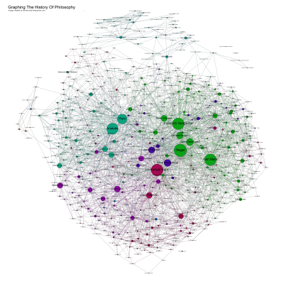 Någon har ritat en karta över filosofihistorien med hjälp av visualiseringsmjukvaran Gephi, som tagit sig an information från engelskspråkiga Wikipedia. Närmare bestämt “influenced by“-sektionen i informationsrutorna, vilket är data som redan finns lagrad i strukturerad form på DBpedia.