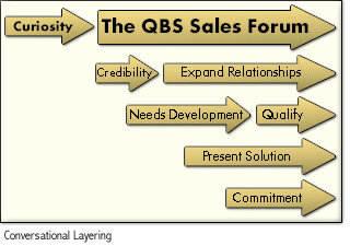 What makes prospects and customers “want to” respond? The answer is: Conversational Layering™. The first time I tried to diagram the sales process, I sketched a cacophony of boxes and arrows into a messy schematic that would make most engineers proud. This model evolved into a much simpler diagram (as shown) that depicts the strategic sales process as a series of prerequisite steps. Before you can secure a commitment, for example, you must first present a solution. Likewise, before you present solutions, you must first uncover needs.