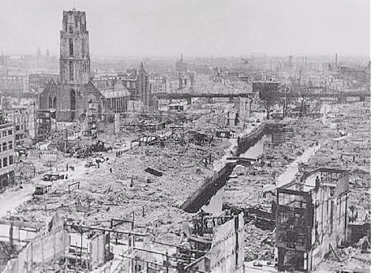 A crushed Rotterdam. The country surrendered a few days later and the queen fled to England.Amsterdam was not bombed but suffered the invasion tactics with the arrival of the Green Police. In the months that followed, the occupying German forces would conduct secret raids and gather and send off young men to work in the German factories. More edicts followed as well as rationing of goods. A wall was built along the North Sea. The country was changing day by day.