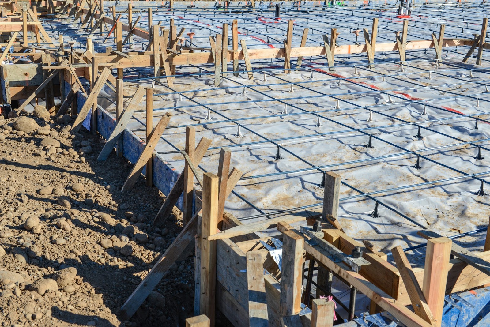 The foundation is the most important part of any building. The materials and work on a slab foundation is literally “set in stone”, and has no room for errors. In this type of foundation wooden forms are built which then hold the poured concrete. A footing trench is dug around the perimeter to provide added thickness along the end of the slab. These edges are stress prone and the weakest point of the foundation. Usually sand or gravel is spread below where the concrete is poured. This technique prevents the slab from sinking under the weight of the concrete. A vapor barrier is usually installed above the sand or gravel, and wire mesh is placed in the center of the slab with rebar (steel rods) in the footing areas to add rigidity and prevent cracking.