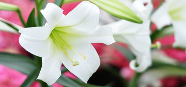 Symbolic of purity and the bodily rising of Jesus Christ, Easter lilies adorn Christian homes and houses of worship on the holy day that shares its name. The flower was so named based on the fact that it often blooms near the time of year that Easter occurs. White reminds us of the purity of Christ and the gold color represents the royalty of Christ.