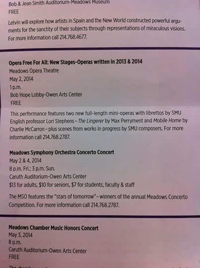 On May 2, 2014 at Southern Methodist University, the opera singers in Meadows School of the Arts will perform the opera libretto that Neil Gaiman and Jeremy Sams chose as the winning libretto for the English National Opera contest: The Lingerer. Max Perryment, the composer, has created an arrangement for a small live orchestra. AND my other miniopera, Mobile Home, will be performed, too! Charlie McCarron is the composer of that little gem. Best of all, it's free! Bring your lunches and come picnic with me in the Bob Hope Lobby of Owen Arts Center.