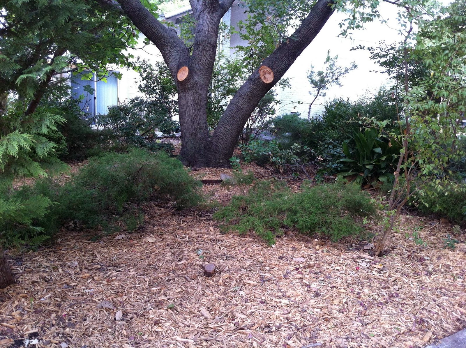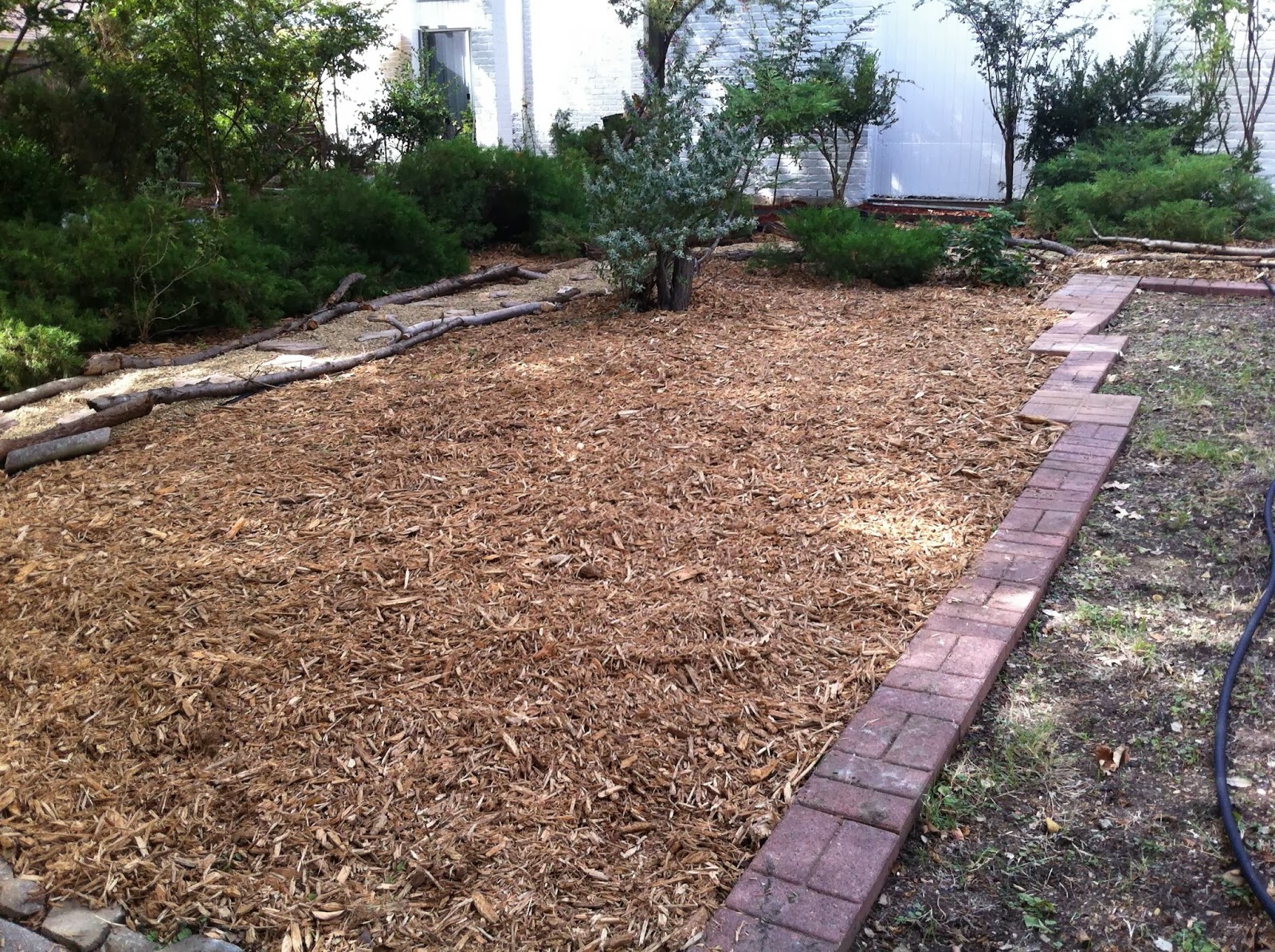 I also covered the bald dirt with mulch and lugged out some red brick barriers: