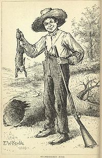 Kemble's drawing of Huckleberry Finn, from the original 1884 edition of the book.My nine-year-old read the Illustrated Classics version of The Adventures of Tom Sawyer for a school book report. He enjoyed it so much that I decided to read aloud to him Adventures of Huckleberry Finn. (I use the word "slave" instead of that infamous other word, which I just can't bring myself to say.) We read one chapter every evening before bed.