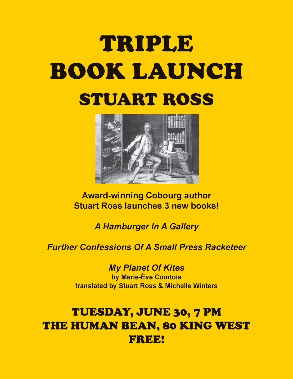 It is true that I now live in Cobourg, even though all the Toronto hasn't been shaken out of me. On Tuesday I'm launching my three new books in my adopted town. I've seen a lot of support for my launches since I moved here, but I'm nervous about this one. Maybe the novelty of a Stuart Ross book launch has worn off. Will anyone show up?