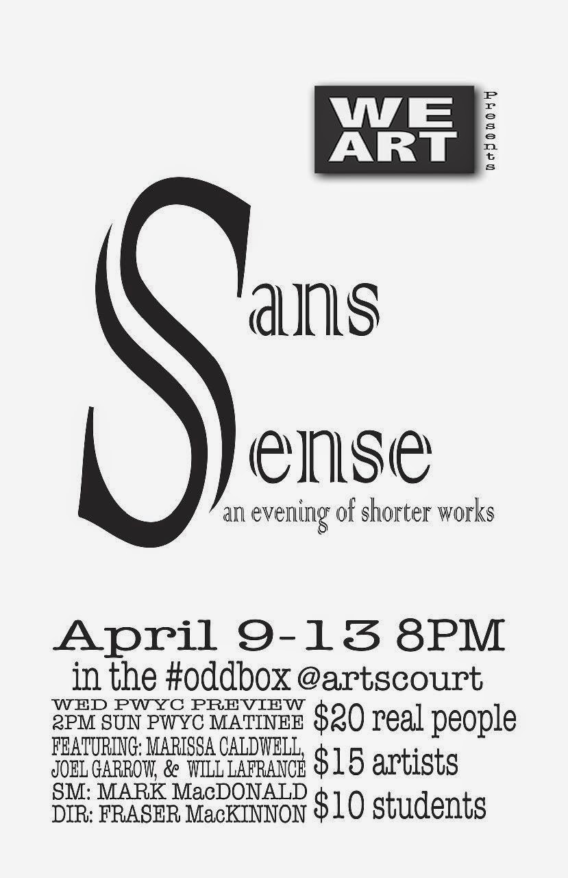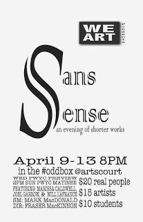 So Sans Sense will feature works by four writers, including me, and the adaptations of my stories, both presumably brief, will be the evening's bookends. The stories he chose are "Shooting the Poodle" and "The Engagement." Both pieces are monologues. I'm going to make the trip to Ottawa to see what he does with them.