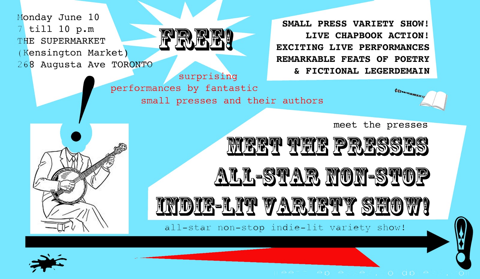 This Monday (June 12), the Meet the Presses collective is offering up a sort of crazy new concept. We have invited a whole bunch of literary presses to do something onstage for about 5 to 7 minutes each. They'll probably also bring some books or chapbooks to sell, but this isn't going to be the usual kind of fair/market.