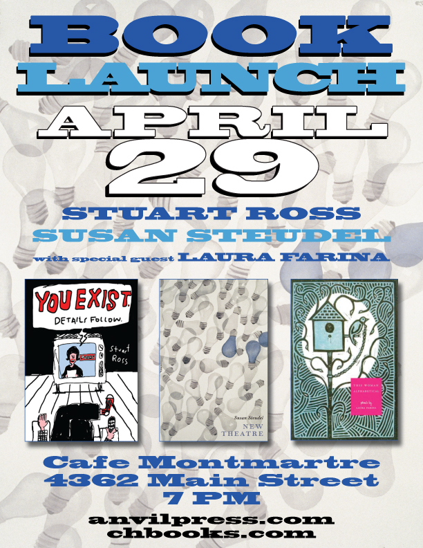 Heading out west this week to launch my new poetry book, You Exist. Details Follow., in Vancouver, Victoria, and the Kootenays. First stop is Vancouver, where I'll launch with Susan Steudel, whose debut poetry book, New Theatre, came out recently from Coach House Books. We'll be joined by a good friend, Laura Farina, whose wonderful first collection, This Woman Alphabetical, came out from Pedlar five or six years ago. About time Laura had another book!
