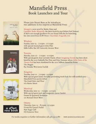 We're travelling from Windsor to Toronto, Kingston, Montreal and Ottawa, and I'll be launching my novel Snowball, Dragonfly, Jew in all but Toronto (where I already launched in May). We have some great guests joining us along the way, including Jaime Forsythe, whose first book of poetry (still untitled) will be released by Mansfield through my imprint in 2012.