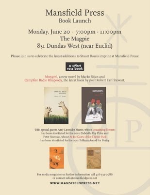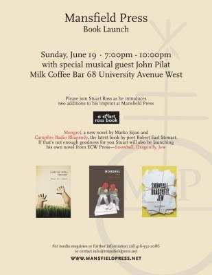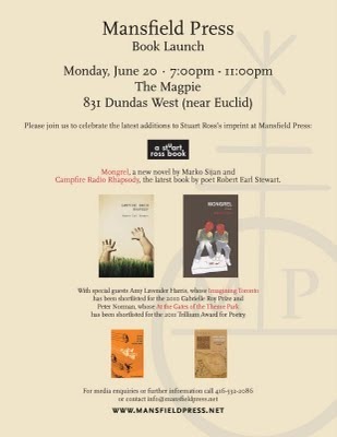 On Sunday, I head to Windsor to kick off a five-city launch tour with the spring 2011 Mansfield authors, Marko Sijan and Robert Earl Stewart. I'm very excited to hear both of them read from their new books, the novel Mongrel and the poetry collection Campfire Radio Rhapsody respectively. These are the four and fifth books to bear the logo of the "a stuart ross book" imprint.