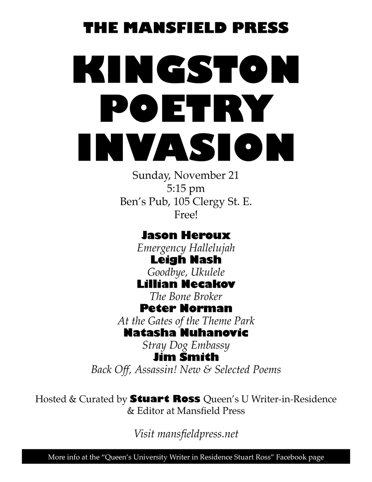 Today! 5:15! Ben's Pub! Kingston! The Mansfield Press Kingston Poetry Invasion featuring readings by the serene Jason Heroux, the surprising Leigh Nash, the mysterious Lillian Necakov, the wily Peter Norman, the optimistic Natasha Nuhanovic, the turbulent Jim Smith. All for free! And hosted by the neurotic Stuart Ross. See you there!