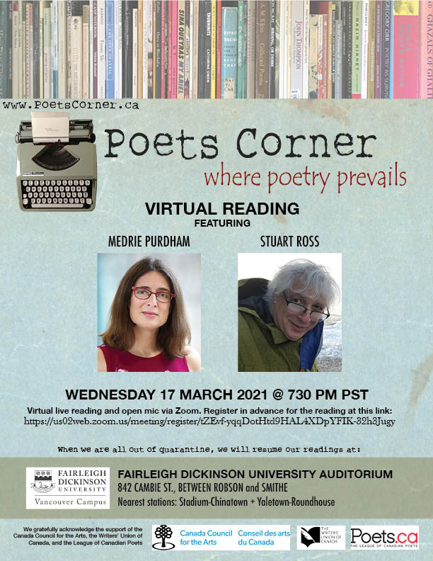 I have a virtual poetry reading coming up on March 17, 7:30 PM PST / 10:30 pm ET, as part of the Poets Corner reading series out of Vancouver. Also on the bill is Medrie Purdham.
