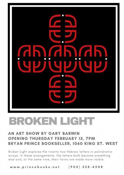 Last night was the opening for my art show, Broken Light, an exhibition of images bases on letters from the Hebrew alphabet. The show was curated by the great Lisa Pijuan-Nomura in the Reading Room of Bryan Prince Bookseller in Hamilton.