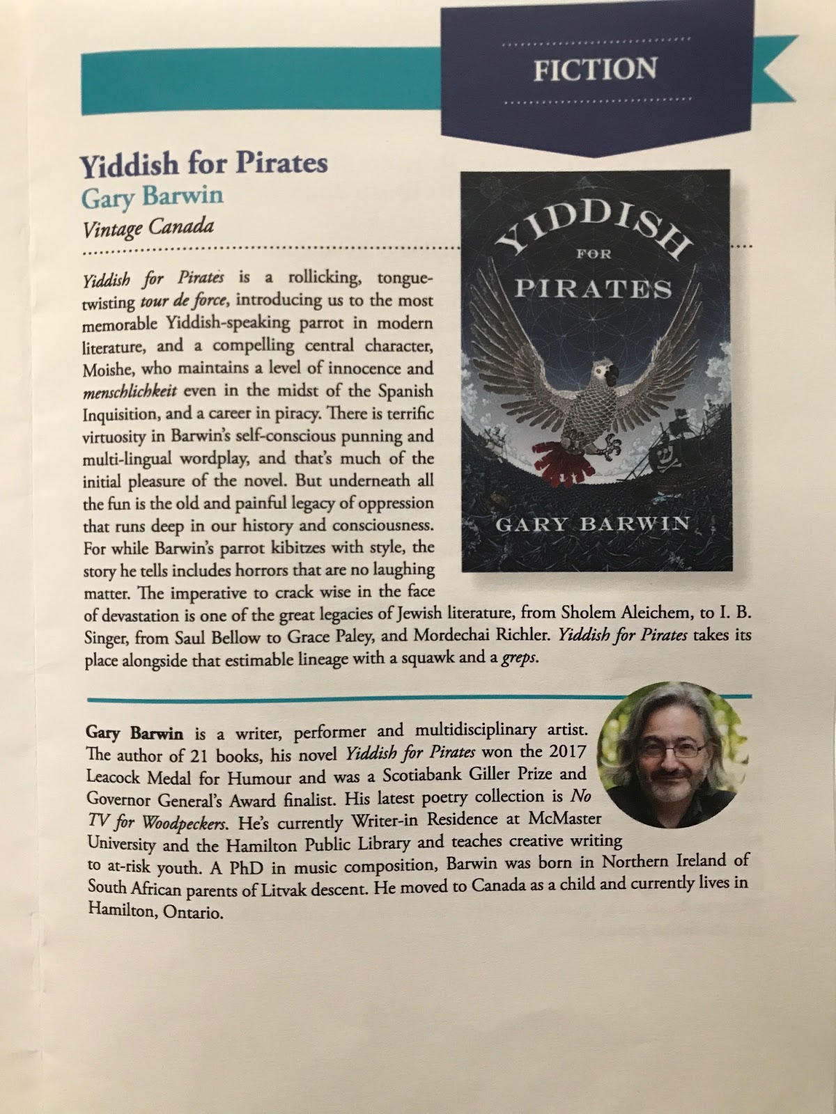 Yiddish for Pirates has won the Canadian Jewish Literary Award for Fiction—and my good friend, Stuart Ross's book A Sparrow Came Down Resplendent (Wolsak and Wynn) won for Poetry.