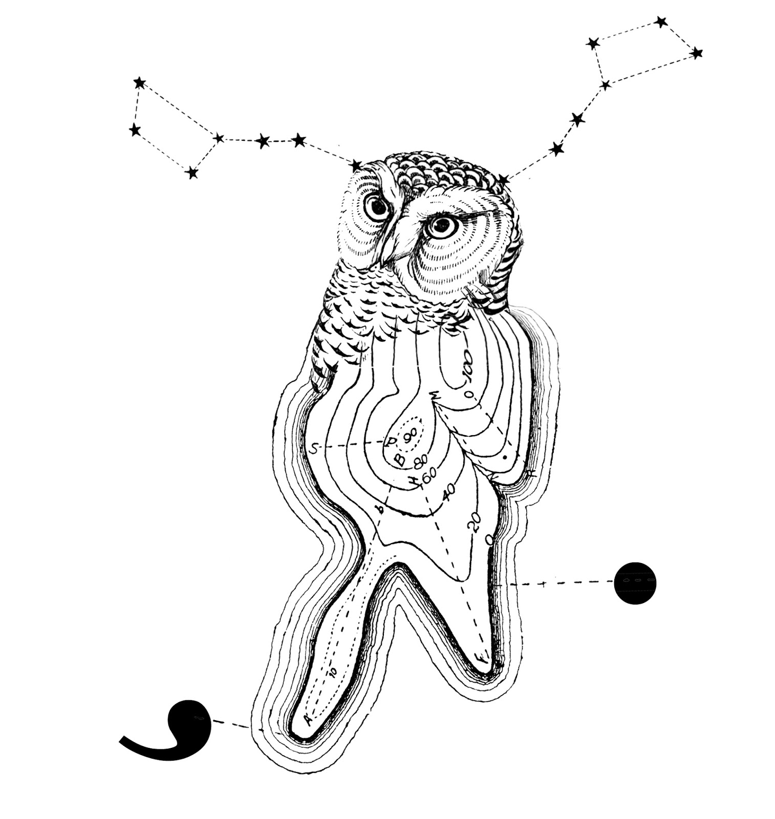 I began with exploring the collision of these various visual elements. Punctuation, the Hebrew and the Roman alphabet. Constellations. Impossible visual illusions. Using Photoshop, I mashed up the images. I scanned some impossible shapes and constellations. Then I modified the shapes and constellations (often I’d create the constellations star by star, dashed line by dashed line using the star and dash elements that I’d scanned from old images of constellations.) By creating empty space between lines (i.e. erasing the white space), Photoshop allows images to break the visual illusion of their shape or solidity. Visual signification intertwines.
