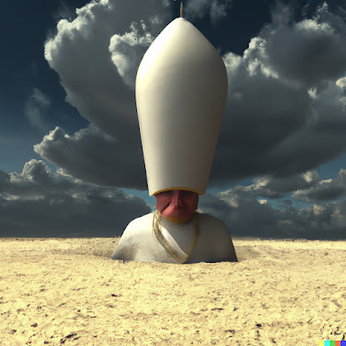 Today was a beach day. We packed cars, brought sandwiches, watermelon and towels. We all arrived at the same time and it sure was busy. The smell of sunscreen reminded everyone of childhood. It was a beautiful day. Someone had brought the Pope. We were bored and so we buried him in sand. Everyone forgot where he was! Finally, the sun went down and we all went home and went to sleep. The Pope was happier in the sand, soft, damp, and cool. One day, he hoped, he’d be discovered.