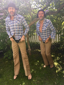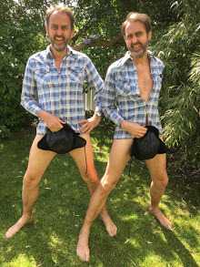 Svein and Egil Nyhus, Norwegian illustrators and twin brothers, posing in youthful clothing as a tribute to spring and sunshine: bib overalls from when they were three, sky coloured jackets from when eleven and flare trousers from their Christian confirmation! Svein works mainly as a book illustrator, Egil as a caricaturist and a cartoonist.