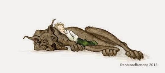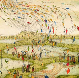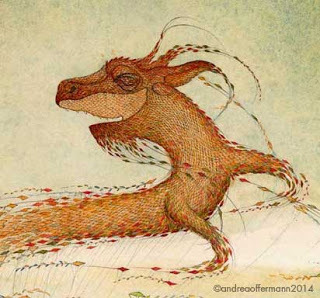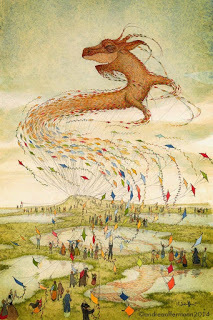 In German, the word "Drachen" can mean both "kite" and "dragons". You might remember that I painted this originally for the cover of the SCBWI magazine "Kite Tales". They asked that whatever I decide to paint include a kite. I wanted to play on the double meaning in German, and also create a happy dance of many kites, to honor the very supportive community of SCBWI by suggesting that when many people come together determined to create something together wonderful things can happen, like dancing dragons in the sky.
