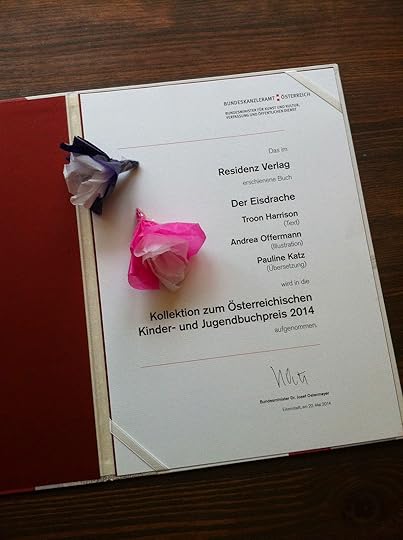 Dieses Frühjahr bekam ich Post vom "Bundesministerium für Unterricht, Kunst und Kultur" in Österreich, mit wunderbaren Nachrichten: "Der Eisdrache" wurde in die Kollektion zum Österreichischen Kinder- und Jugendbuchpreis 2014 aufgenommen, ich habe mich riesig gefreut!