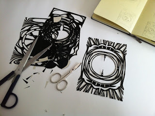I was very excited when Kate Milford asked me if would create the cover image for the book. Since this book stands on its own yet is related to the full length novels I wanted to try something a bit different and decided to work with paper silhouette. Here are a few of the first paper cuts and sketches: