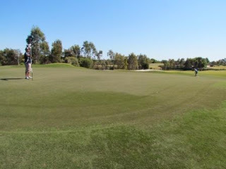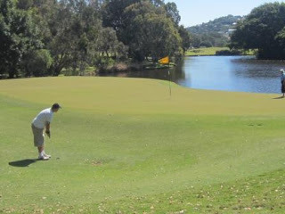 12th greenLoved the 12th hole, a par 5 of 408 metres. In fact, all the par 5s are great tests of accuracy and strategy. The 12th has an elevated tee and you feel like you're hitting into space because the fairway rises up ahead of you, before it and the trees on the sides disappear. Fiona cut her drive and ended up in trees on the right while I hit the best drive of my round and was well down on the flat, just 195 metres from the hole. Fiona had a difficult chip out and ended up with double bogey. Driving the fairway is a must, on this hole.There's a large pond on the left to catch duffs and hooks and a bunker in front of the green to catch those who think they can hit the ball further than they can (99% of golfers). I hit a solid 3 wood and then played a nice half wedge on to the green and ... bloody well 3 putted again.