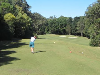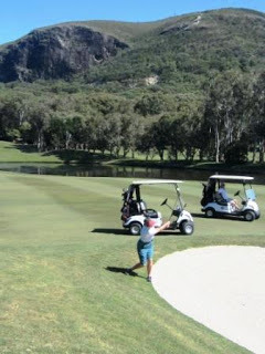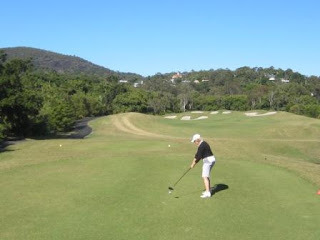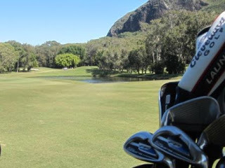 Looking back towards 13th tee and Mt CoolumConsidering the green fees alone are usually $115, we leapt at the opportunity of becoming Aussies for one day, so that we could take advantage of such a great offer.We practiced our Aussie accents for a couple of hours and then got the best mimic (Fiona) to ring the course and book us in at 8.20 on a Wednesday. Fiona sprinkled liberal amounts of the word 'mate' in her conversation, and avoided any words containing 'i' and got the booking. There are a lot of visually intimidating holes on this course, with very few flat fairways and all the hillocks seeming to fall sharply into the water.Apart from the ones which fall sharply into bunkers.