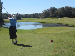 9th tee ... yes, my bum does look big in thisI'm tempted to call the 9th the signature hole, but you could probably call half the holes signature holes. Par 4, 286 metrres. There didn't seem to be a lot of run on the course because I hit a good drive here, a solid 3 wood and I was still 6 feet short of the green. After which I chunked my chip and 2 putted for bogey. Fiona hit the green in two (driver, 3 wood) and sank a 10 ft putt for birdie.Fiona 40, Kay 44.The 10th is a fiendishly tight 292 metre par 4. Water all the way up the left, and a long bunker just above the water, and bunkers in the landing area if you bail out too much to the right. I hit driver and 7 iron to be 10 feet past the pin ... from where I 3 putted! Damn kangaroo poo again. (Didn't see it, but there's no other reason I could 3 putt from so close.)