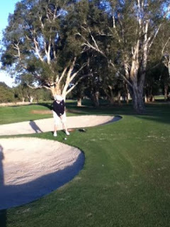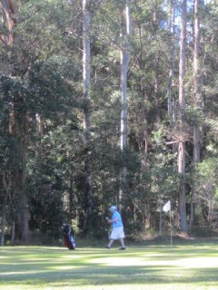 8th green, framed by majestic gum treesI could see the sweat on Fiona's brow as she contemplated her shot to the green. She was only 2 shots ahead of me, and I was chipping better than a fish 'n' chip shop navvy.