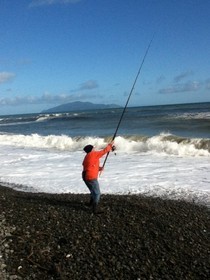 Here's a photo of the fishing expert surfcasting at the Otaki river mouth.